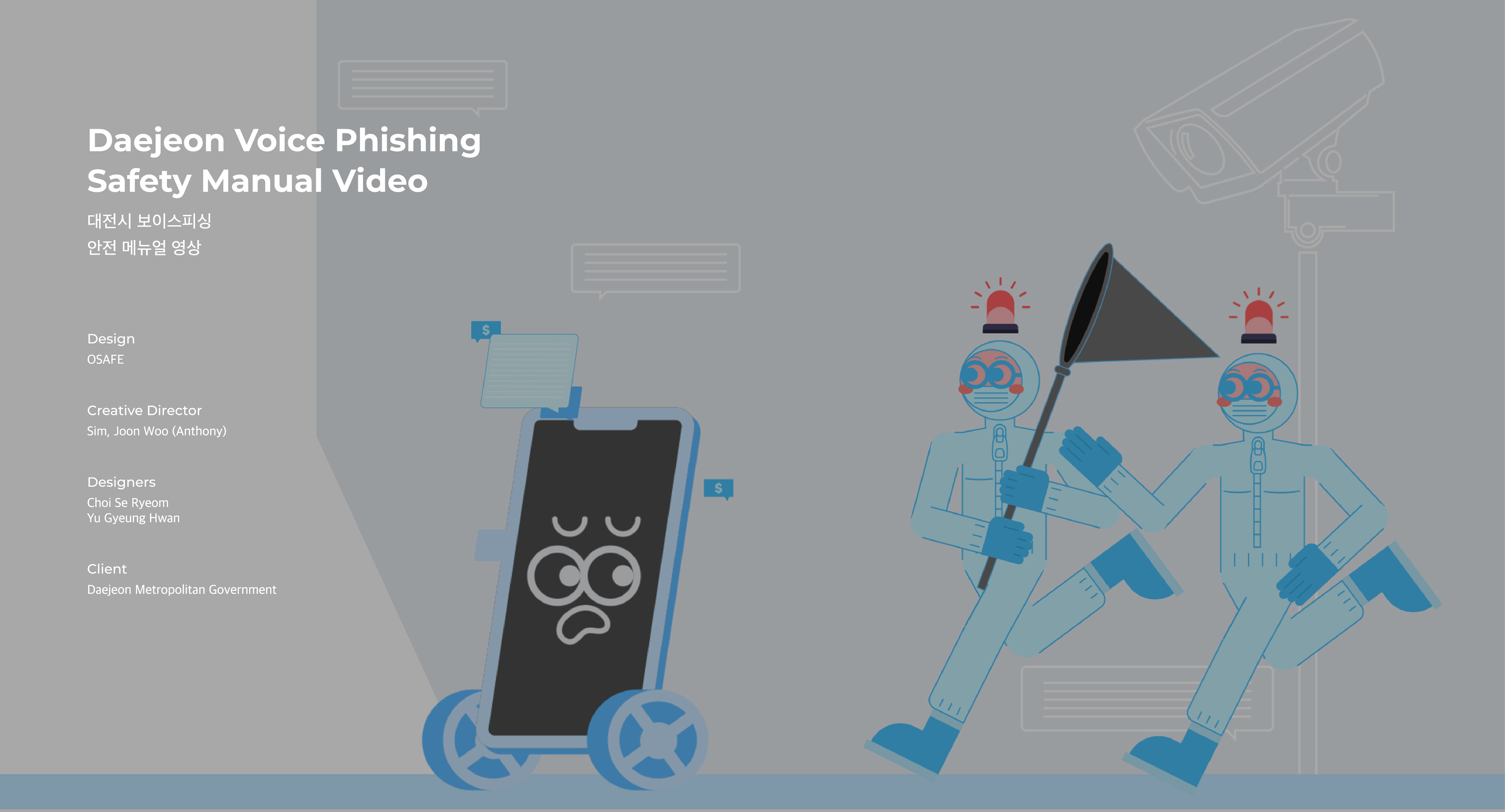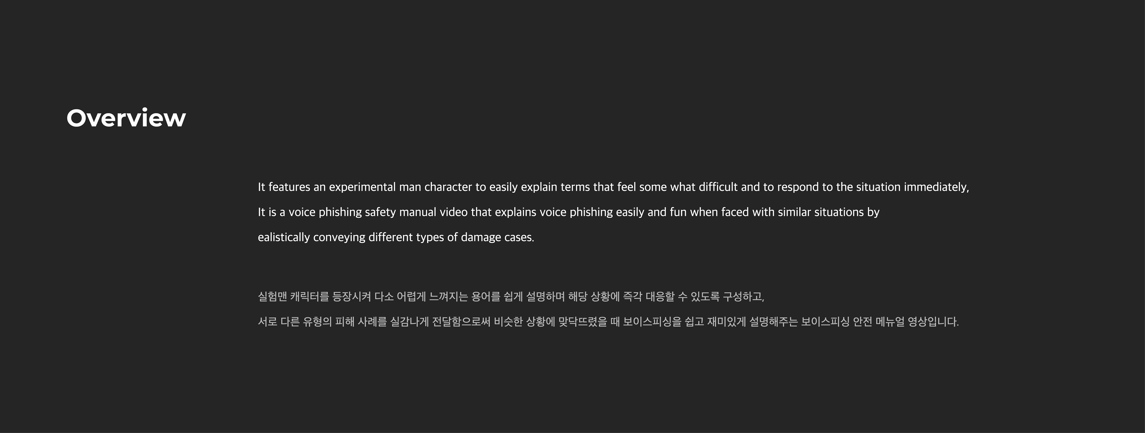 실험맨 캐릭터를 등장시켜 다소 어렵게 느껴지는 용어를 쉽게 설명하며 해당 상황에 즉각 대응할 수 있도록 구성하고, 서로 다른 유형의 사례를 실감나게 전달함으로써 비슷한 상황에 맞닥뜨렸을 때 보이스피싱을 쉽고 재미있게 설명해주는 보이스피싱 안전 메뉴얼 영상입니다. It is a voice phishing safety manual video that easily explains terms that seem somewhat difficult by featuring experimental man characters, organizes them to respond immediately to the situation, and easily and funly explains voice phishing when faced with similar situations by delivering different types of cases realistically.